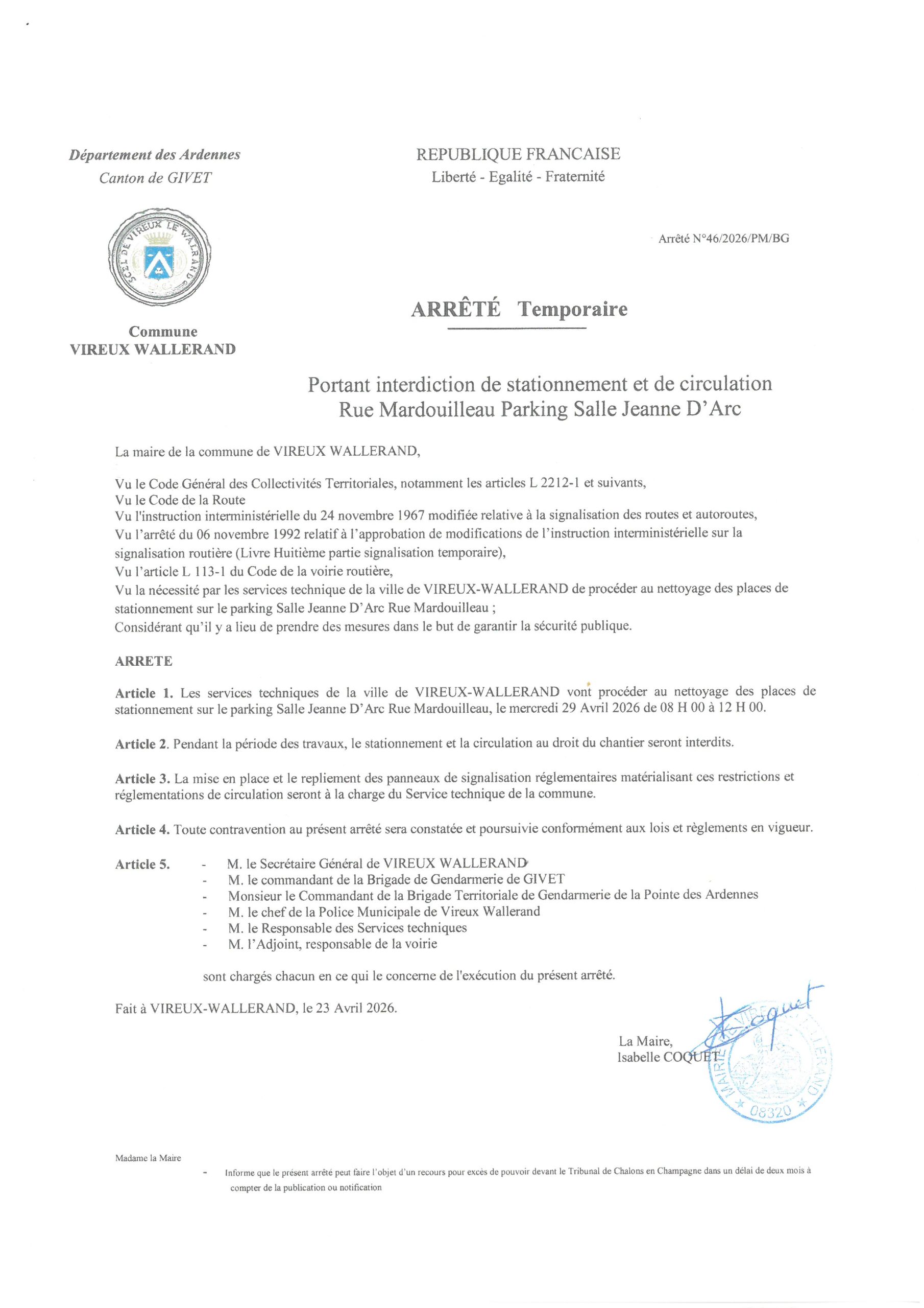 Arrêté portant interdiction de stationnet et circuler Rue Mardouilleau Arrêté portant interdiction de stationnet et circuler Rue Mardouilleau
